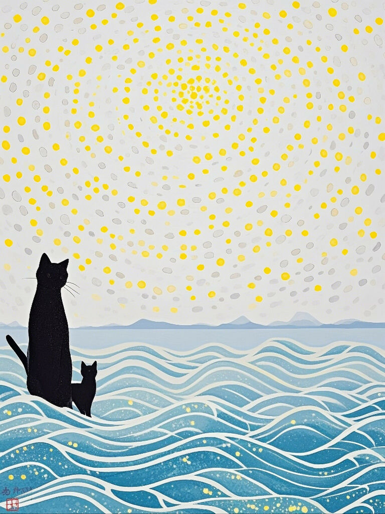 Against an endless sea of swirling waves, two black cats stand still—gazing toward a golden, dotted sun radiating upward from a quiet sky.