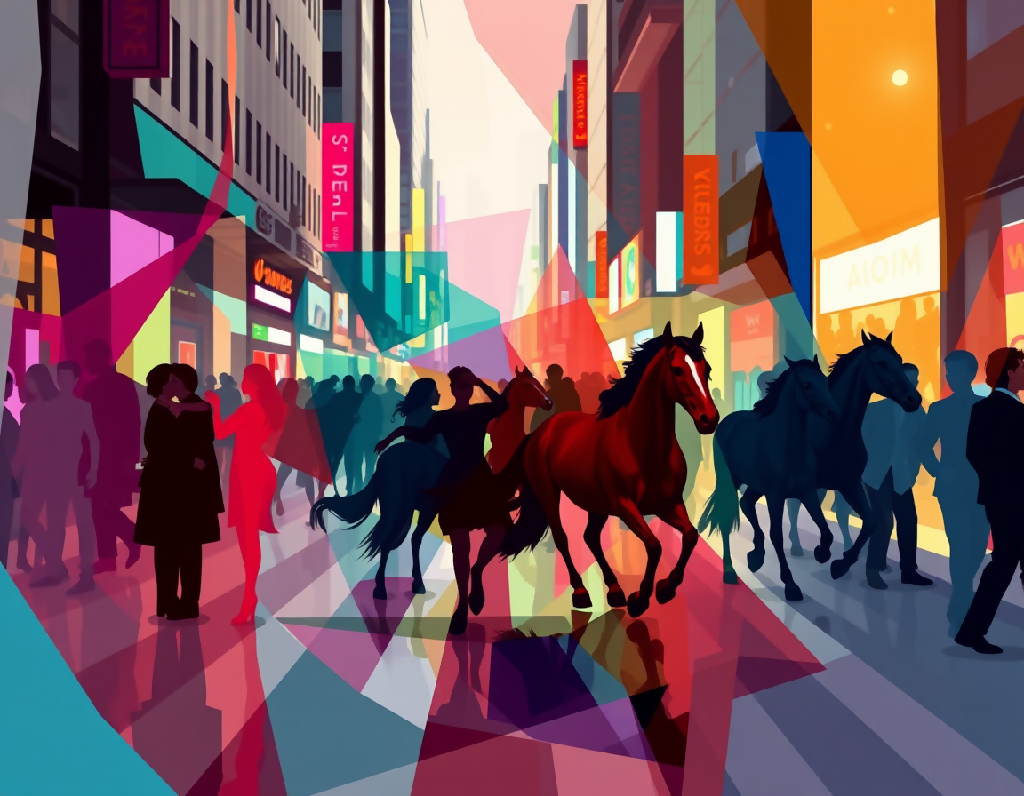 Explore a captivating minimalist abstract art scene, where love, energy, and movement are subtly hidden within geometrically-shaped, glass-like fragments. This artwork leaves much to interpretation, blending human emotions and animalistic energy. Couples in loving embraces and kisses, as well as horses running, are suggested behind angular, multi-colored glass pieces that cast soft reflections and shadows. The vibrant blues, reds, yellows, and pastel shades create a dynamic atmosphere, while sharp edges and overlapping geometries evoke a sense of both serenity and mystery. The scene's fragmented composition invites curiosity, making every viewer experience a unique impression of love and motion. This abstract masterpiece leaves the boundaries of reality behind, challenging perception and creating an emotional connection with the viewer. Perfect for those who appreciate art that speaks through suggestion and emotion, offering endless possibilities of interpretation.
