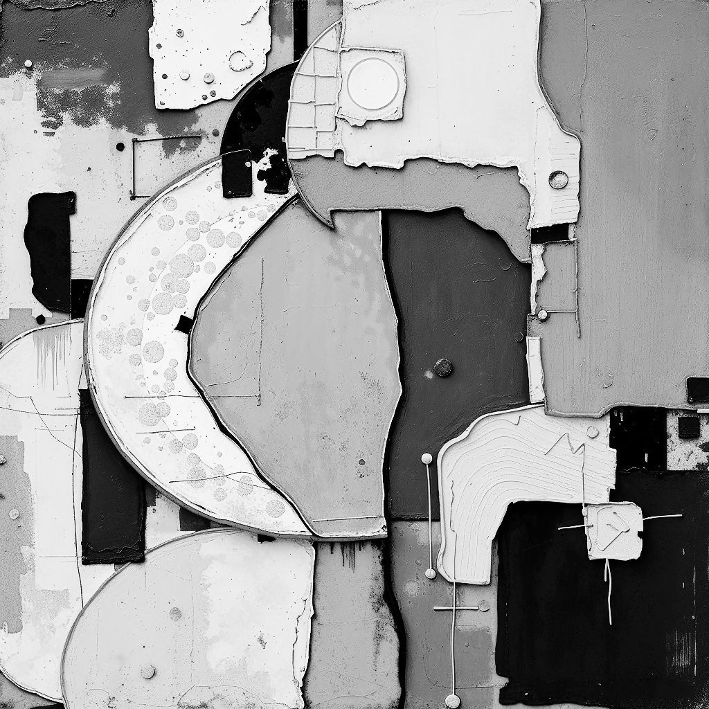 An abstract masterpiece featuring a dynamic interplay of geometric shapes and textures in monochrome tones. Curved and straight lines merge seamlessly, creating a visually intriguing composition that evokes depth and sophistication.
