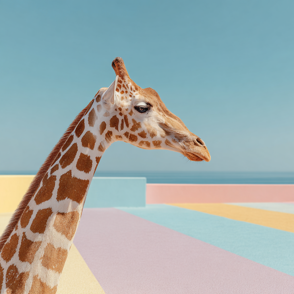 Tags: pop art giraffe, geometric background, pastel colors, surreal safari, abstract wildlife, ocean view
