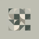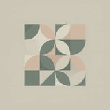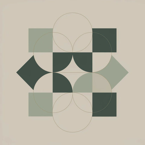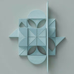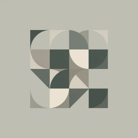 A minimalist masterpiece of interlocking geometric shapes, featuring circles, squares, and triangles. The calm, muted color scheme consists of soft pastels in shades of blue, with a touch of white to maintain simplicity. The shapes are arranged in a balanced, symmetrical composition, with ample negative space that exudes a sense of quiet elegance and precision.