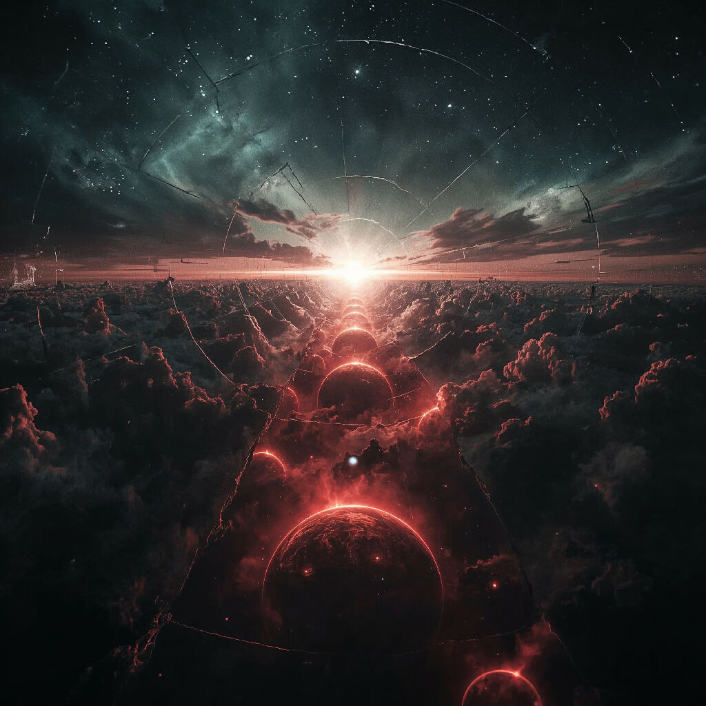 Geometric forms pierce through nebular clouds in this meditation on creation and cosmic order. A brilliant central light source radiates outward through concentric circles and angular frameworks, suggesting the moment of universal birth or divine intervention. The composition moves from chaotic red energies below toward ordered celestial structures above, implying transformation from primordial chaos to cosmic harmony. Planetary bodies float within the geometric matrix, their surfaces glowing with internal fire. The interplay between organic nebular forms and precise mathematical structures reflects humanity's attempt to understand infinity through reason. Cool blues and greens yield to warm reds, creating a visual symphony of emergence and enlightenment.