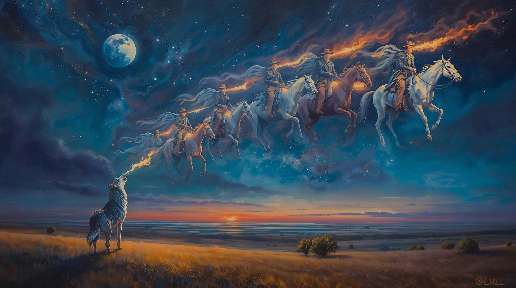 Ethereal painting of ghostly cowboys and stallions riding in the sky catching the attention of a wolf.