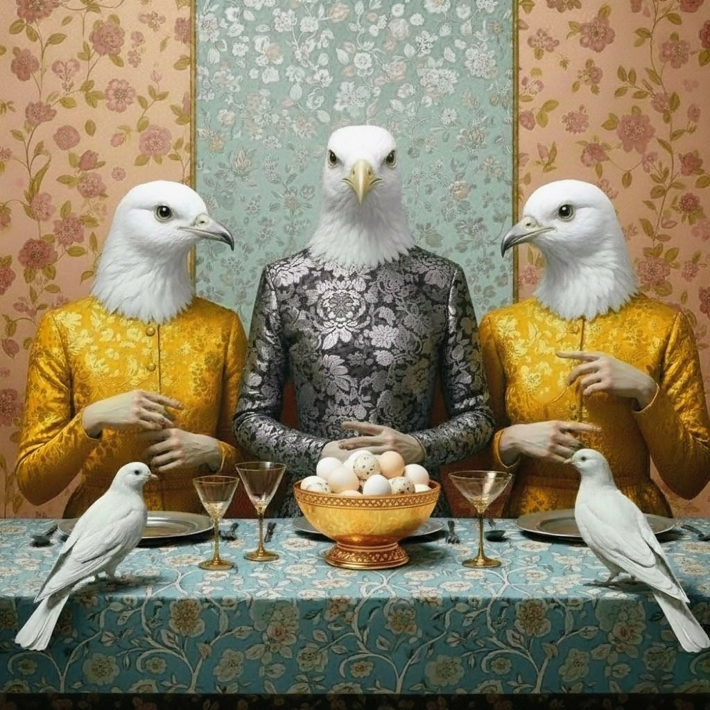 A surreal family portrait unfolds at a lavishly set table, where three elegant figures with white bird heads sit poised in ornate brocade jackets. The central avian host in silver-grey is flanked by two companions in rich gold, all framed by vintage floral wallpaper and a patterned tablecloth. A golden bowl overflowing with eggs, crystal glasses, and four white birds perched along the table add a quietly humorous twist to this refined scene.
