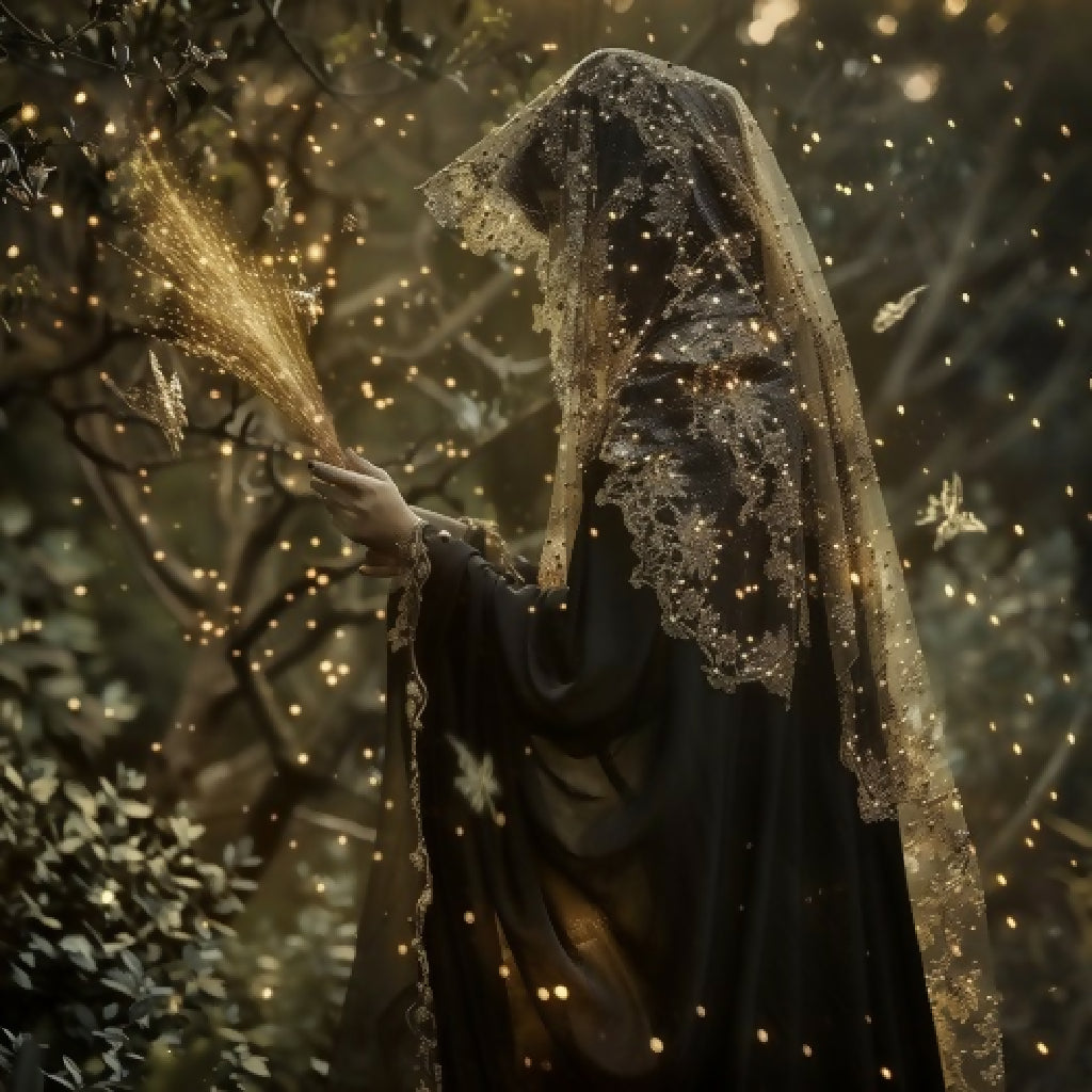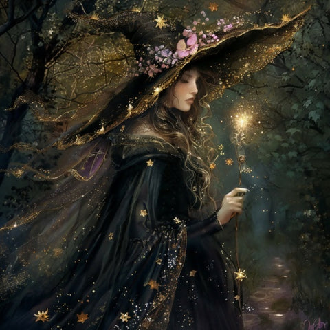 一个美丽的女巫,戴着一顶装饰着鲜花的华丽帽子,手里拿着一根魔杖,施展着魔法咒语。她站在夜晚穿过黑暗森林的小路上,星星和星座充满了天空。这幅画是幻想艺术的风格,有着细致的面孔和错综复杂的细节。它是一种高分辨率、高清晰度、高质量、高细节、超逼真和超详细的渲染