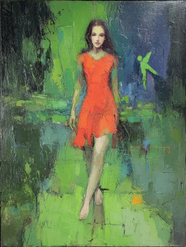 The painting depicts a strikingly vibrant and textured image of a woman walking barefoot on a surface composed of abstract blocks of green tones. She is wearing a bright orange dress that stands out boldly against the rich, predominantly green background. The brushwork is loose and expressive, creating a dynamic interplay between the colors and textures.