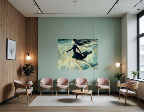 The painting presents a delicate, ethereal scene featuring a woman in motion. She wears a flowing black dress that billows around her, accentuating her graceful movement. Her long, dark hair streams behind, blending with the cool-toned, abstract background. The backdrop is painted with painterly strokes of blue, teal, and hints of soft gold, creating an impression of wind or rain, and infusing the scene with a dreamlike atmosphere. The woman's barefoot stride and outstretched arms evoke a sense of freedom and lightness, as though she is walking on air or dancing through an unseen landscape. The overall style is whimsical and expressive, blending elements of realism and abstraction to convey both movement and emotion.