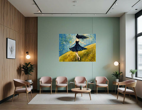 The background features a dreamy, blue sky textured with soft brushstrokes and flecks of yellow, creating a starry or magical atmosphere. The contrast between the deep blue of her dress and the warm gold of the hill highlights her presence at the center of the composition. Overall, the painting evokes feelings of serenity, movement, and carefree joy, capturing a fleeting moment of connection between the figure and the expansive, enchanting landscape around her.