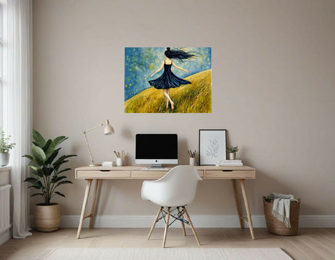 The painting depicts a graceful, whimsical scene of a young woman standing barefoot on a golden hillside. She wears a flowing black dress that swirls gently around her as if caught by a soft breeze. Her back is turned to the viewer, and her arms are extended outward, suggesting a sense of freedom or lightness. The woman's long, dark hair streams behind her, further emphasizing the movement in the scene.