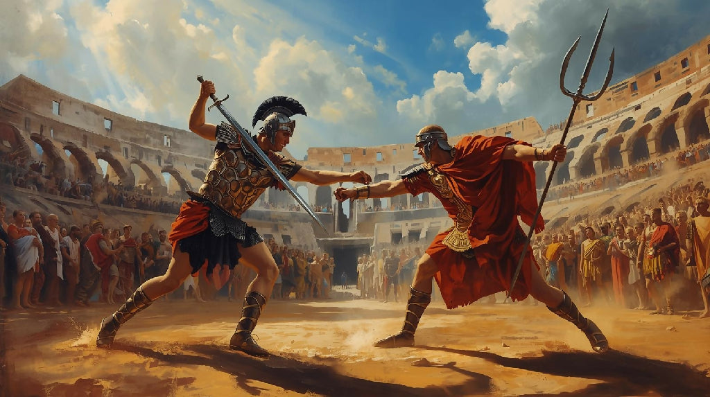 Vivid painting of two gladiator's battling it out in the Roman Colosseum with the audience looking on.