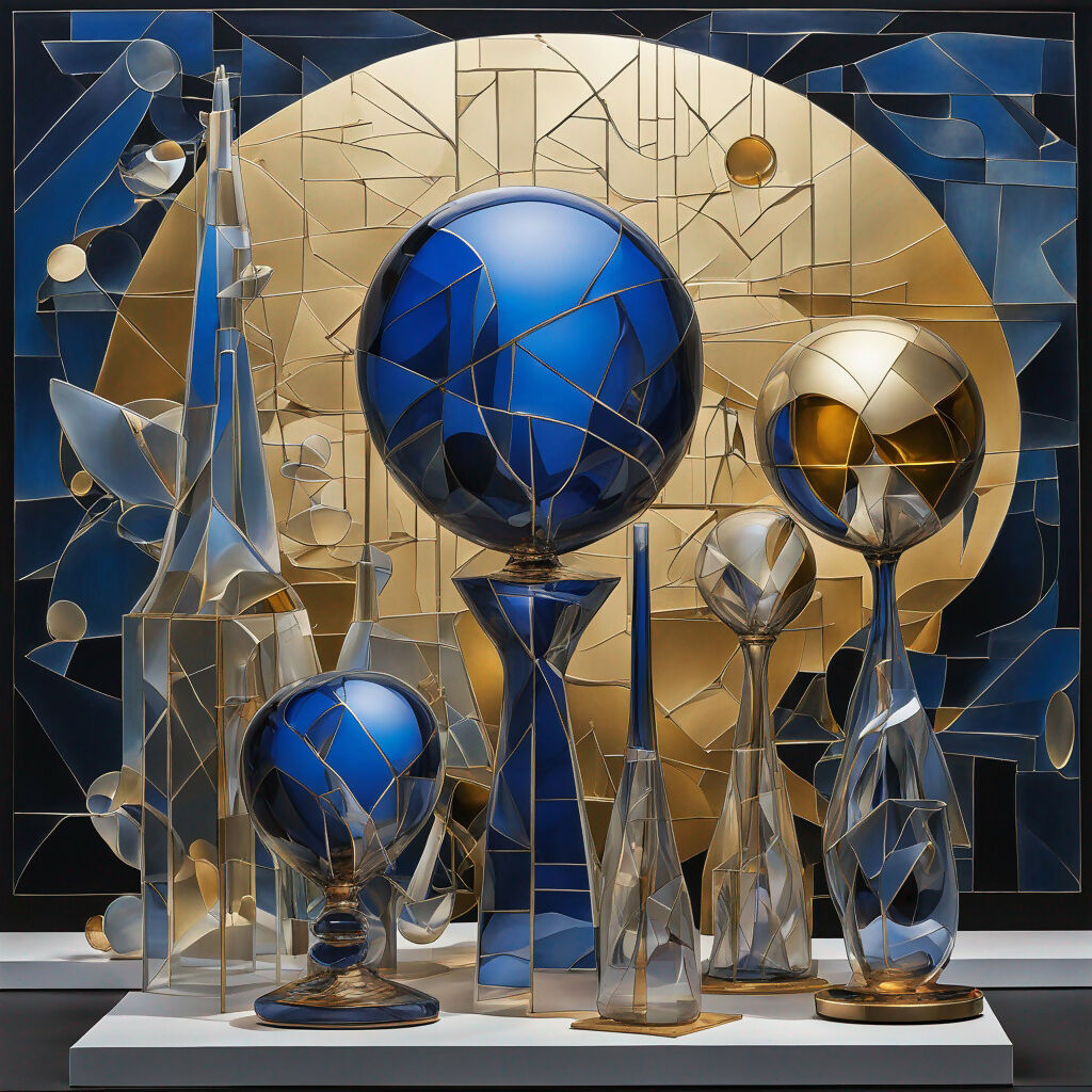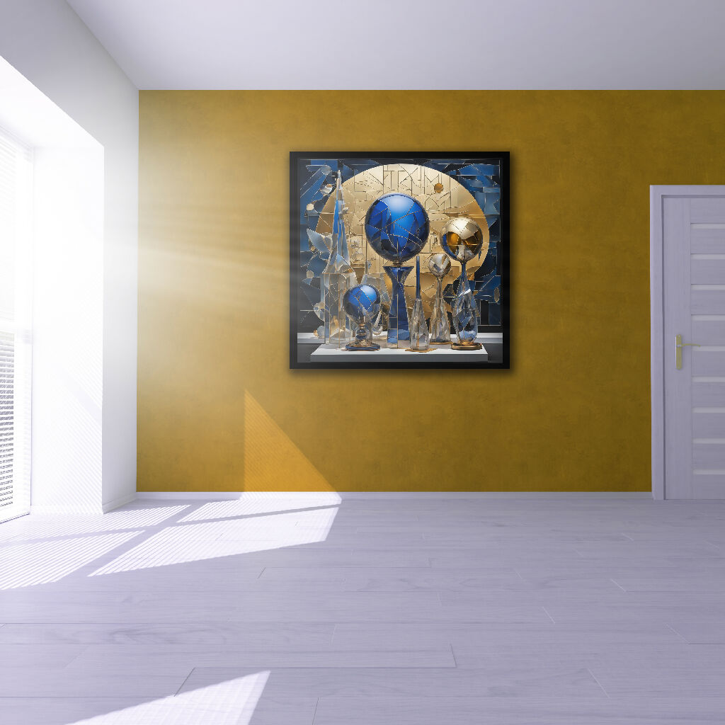 This meticulously detailed still life brings a sense of sophistication. Featuring a collection of mosaic-glass spheres and vessels in shades of deep blue, gold, and gray, it suits either a modern or classical décor. With abstract geometric shapes in gold, blue, and dark backgrounds; the mosaic style is prominent. The overall style evokes stained glass, intricate artistry, and a sense of depth and dimension.