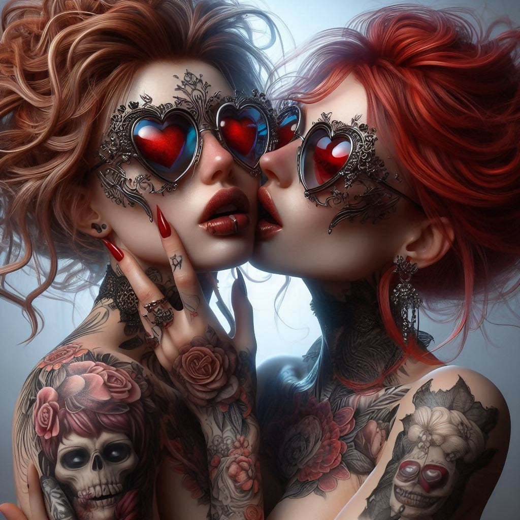 2 friends hugging. Tattooed, decorated glasses.
