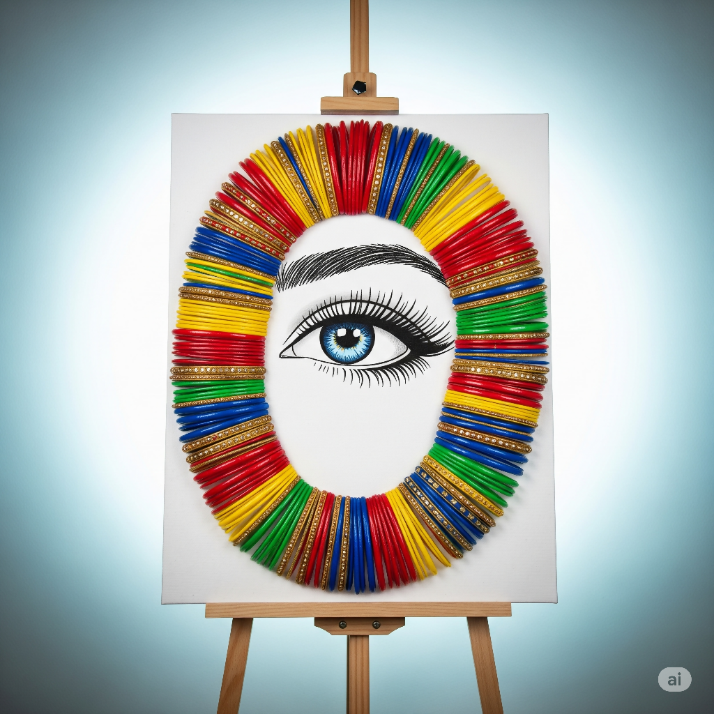 An enchanting digital illustration featuring a vibrant 3D-effect eye, framed by a lively circle of red, yellow, blue, and green bangles. This unique piece captures a blend of traditional elegance and modern artistic vision, set against a bright white canvas with a subtle fluorescent blue glow, presented on a classic painting stand. Perfect for adding a captivating and colorful focal point to any space.