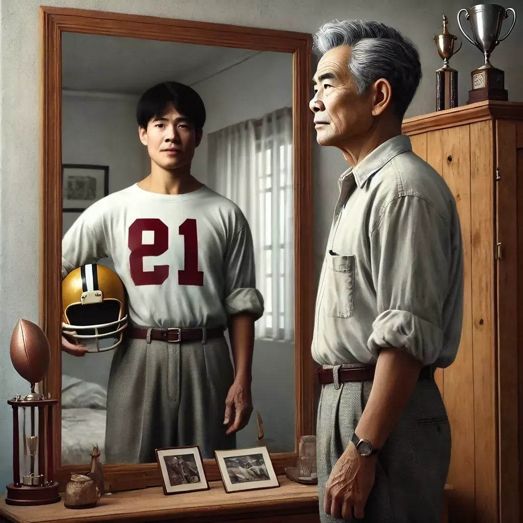 This poignant AI-generated painting captures the passage of time through the eyes of an elderly Asian man standing before a mirror. He gazes at his reflection—where he sees himself as a much younger high school football player, full of youthful energy and ambition. This artwork beautifully encapsulates themes of memory, ambition, and the enduring spirit of one's youthful dreams. Perfect for sports lovers, nostalgia enthusiasts, and anyone who cherishes the journey of a lifetime.