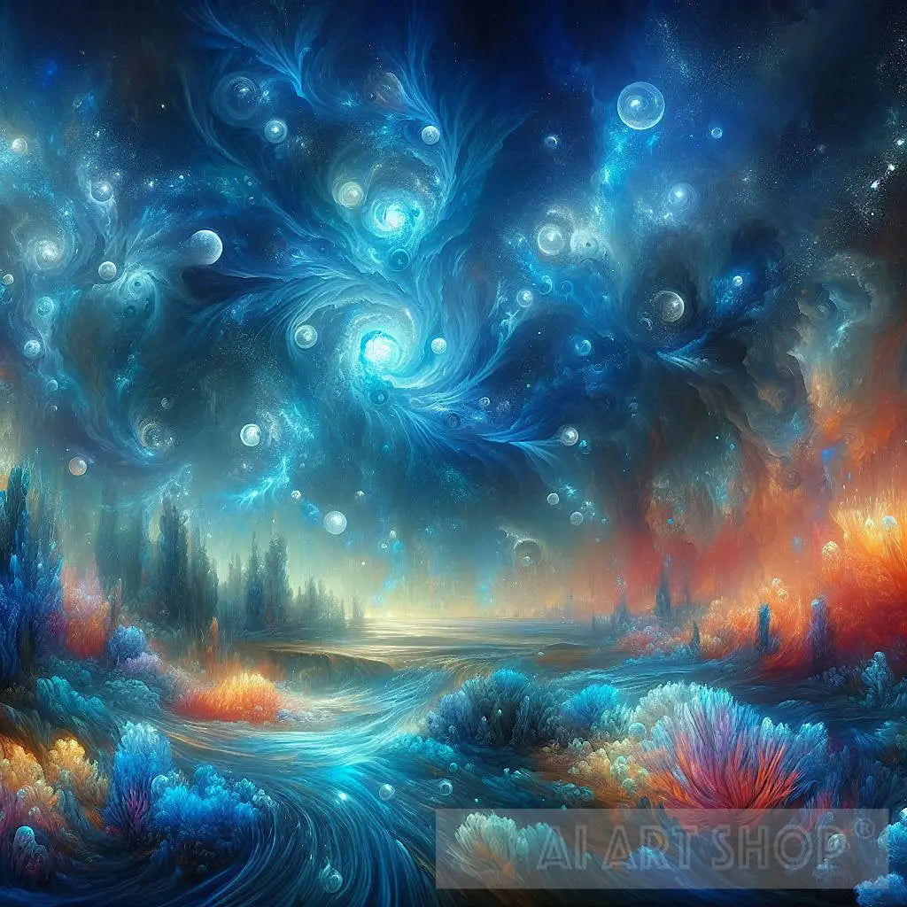 "Glowing Aquatic Haven" unveils a submerged paradise filled with bioluminescent wonders. The artwork beckons viewers to delve into an enigmatic world where shimmering corals and radiant creatures create an underwater haven of unparalleled beauty and intrigue, evoking a sense of wonder and fascination.