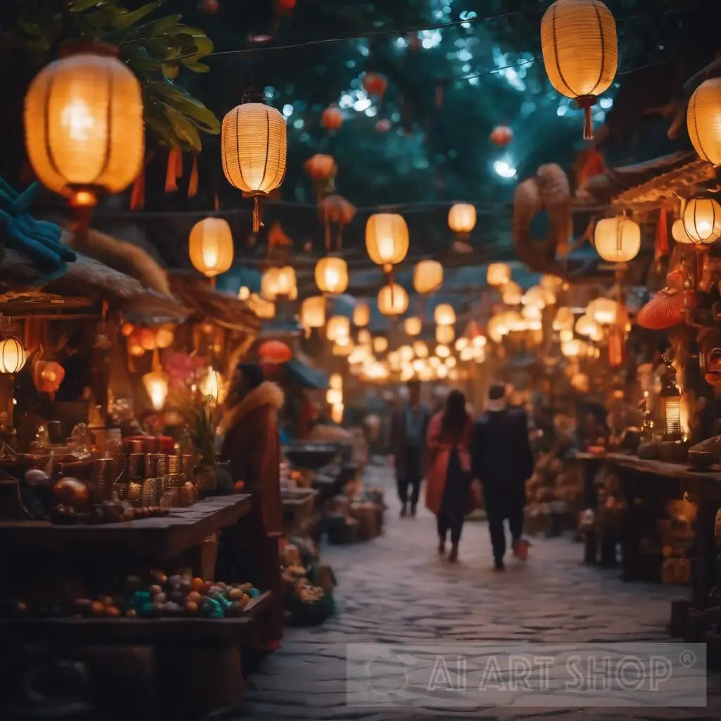 A mystical marketplace with glowing lanterns and exotic creatures.