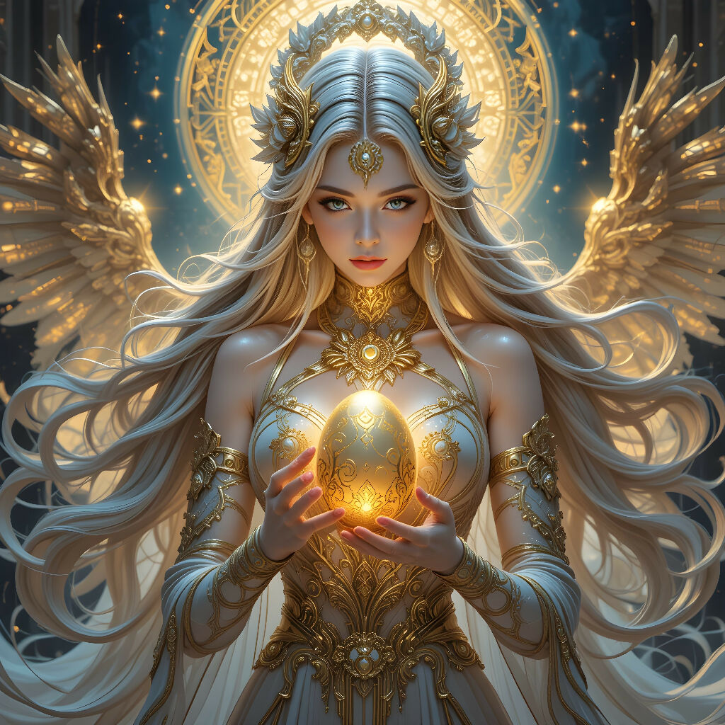 An elegant majestic goddess holding a a golden eggs , beautiful long hair and glowing lights, in the style of anime art, frozen movement, shiny, glossy, aurora punk, hyper-detailed illustrations.