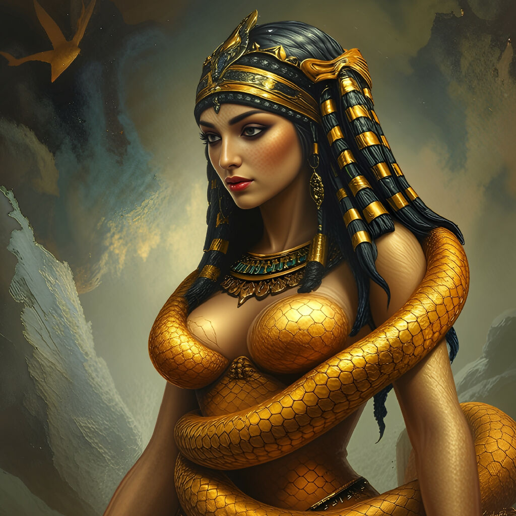 Fantasy painting of Cleopatra as a serpent goddess, half-human half-snake, golden scales shimmering.