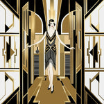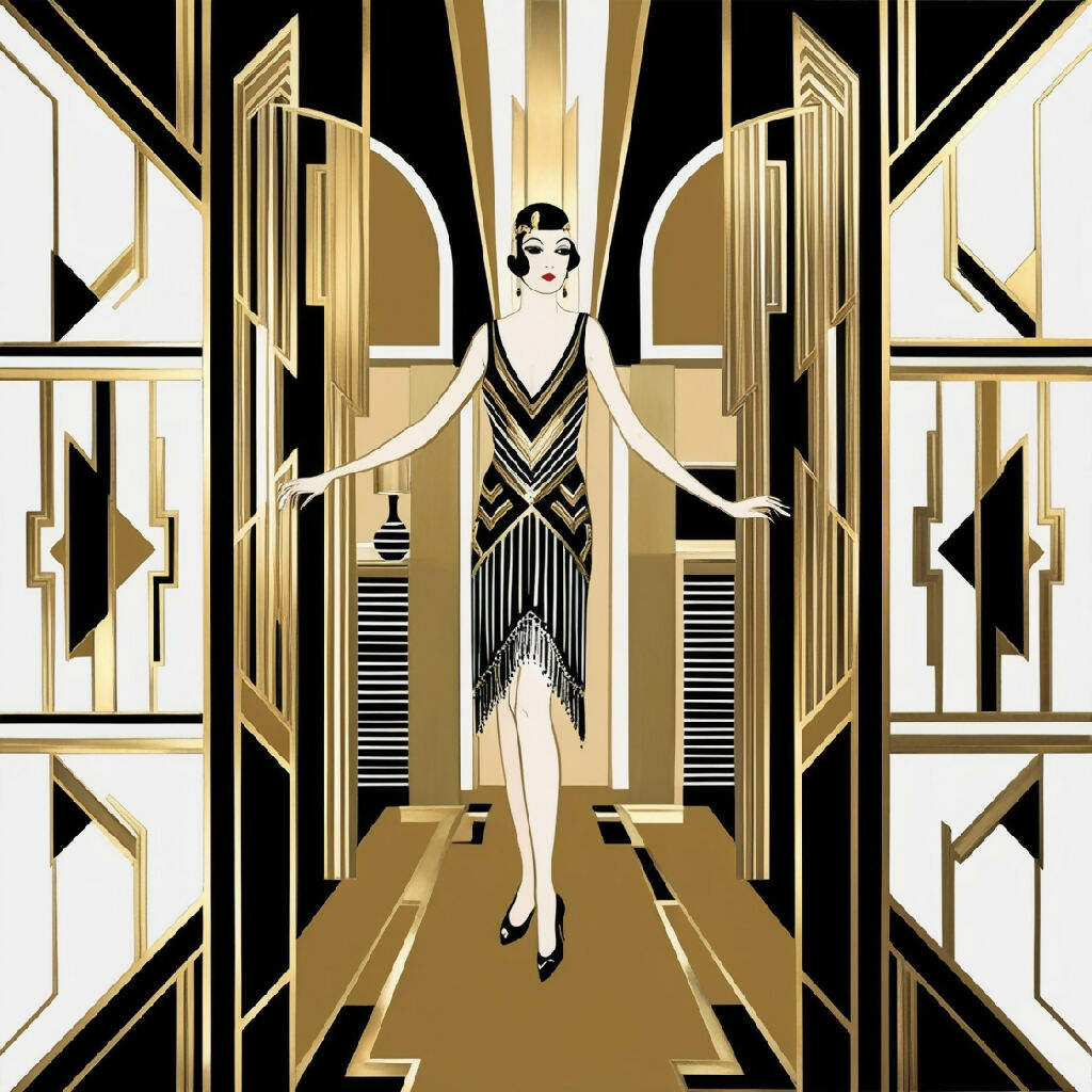 A painting that embodies the elegance and luxury of the Art Deco era. Depict a stylish flapper in a glamorous setting, surrounded by geometric patterns, bold lines, and metallic gold accents. The composition should exude sophistication, with a strong sense of symmetry and a limited color palette featuring black, white, gold, and deep jewel tones.