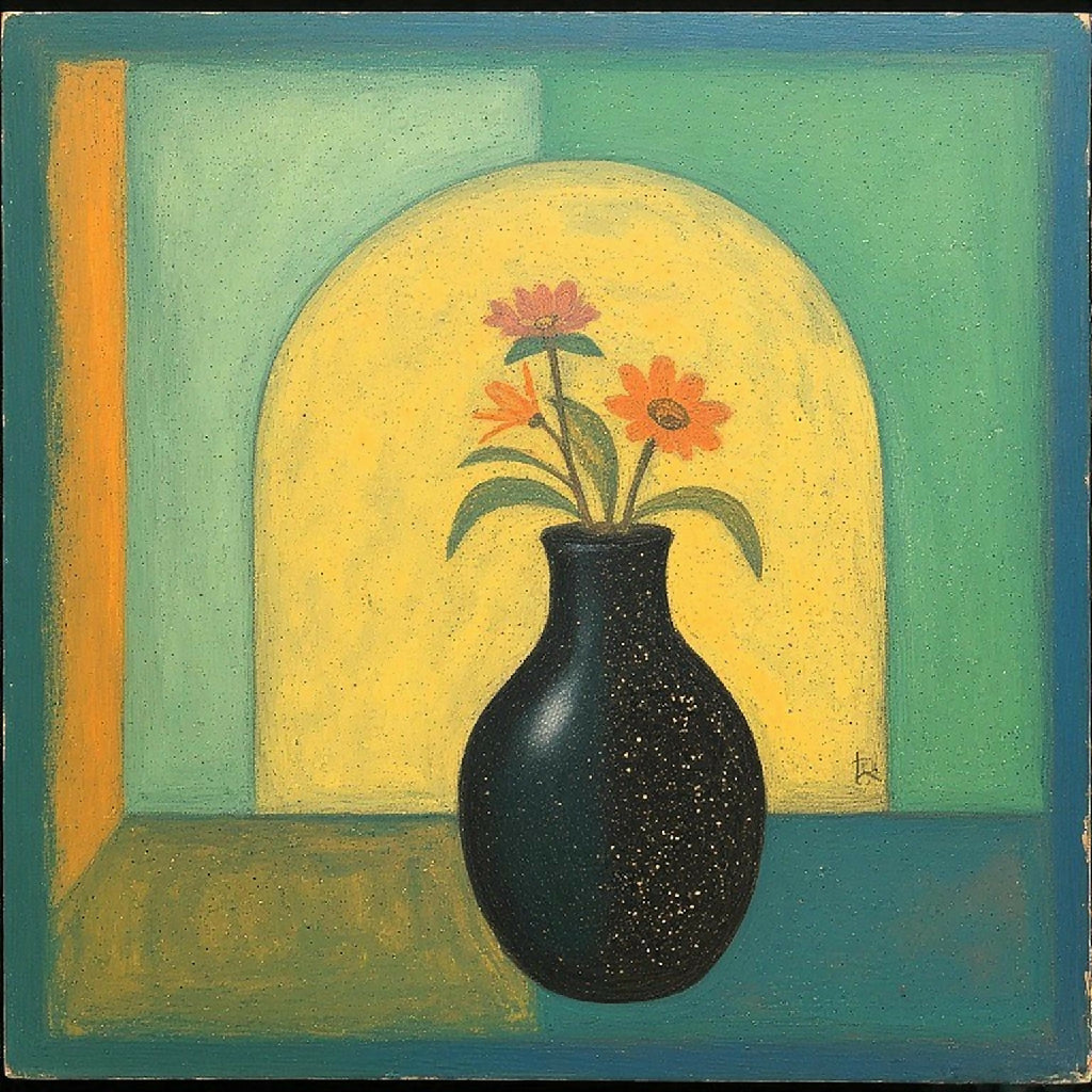 This still life painting features a dark, speckled vase holding a simple yet elegant bouquet of three flowers, two orange and one pink, with accompanying green foliage.