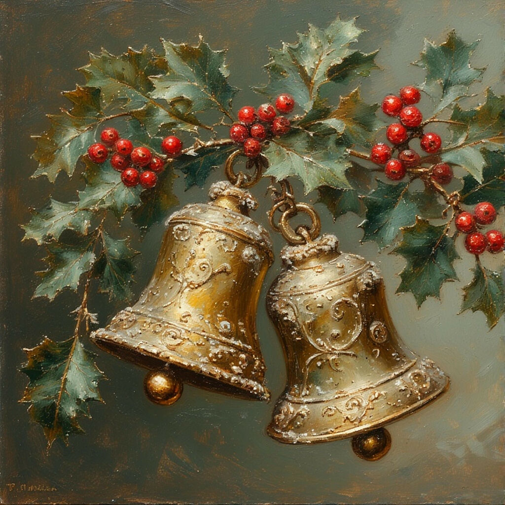 This Ai artwork captures the festive spirit of the holiday season, featuring two ornate golden bells, intricately detailed with swirling patterns and a delicate, frosted texture. They are gracefully suspended amidst vibrant green holly leaves and clusters of bright red berries, symbolizing traditional Christmas cheer.