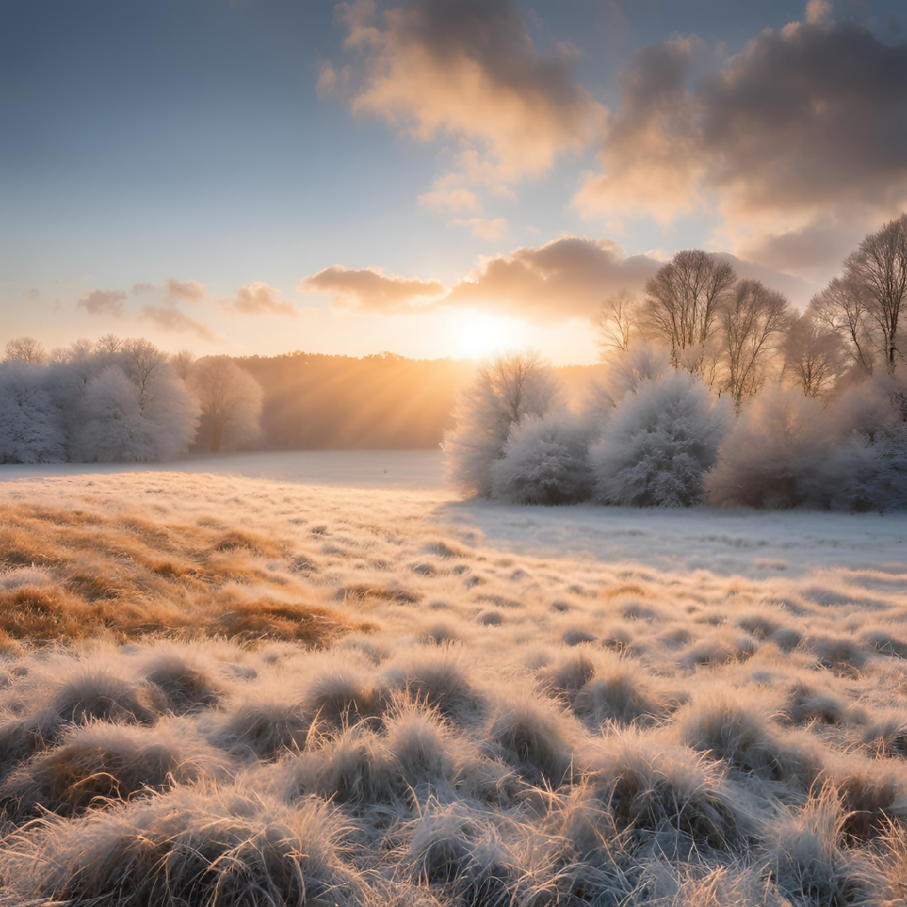 This piece is in a realistic landscape painting or photorealistic digital art style. The soft lighting, warm golden hues, and frosty details emphasise natural beauty with an almost dreamlike atmosphere. The composition and rendering of light also resemble romantic landscape painting styles, with an emphasis on mood and atmosphere.