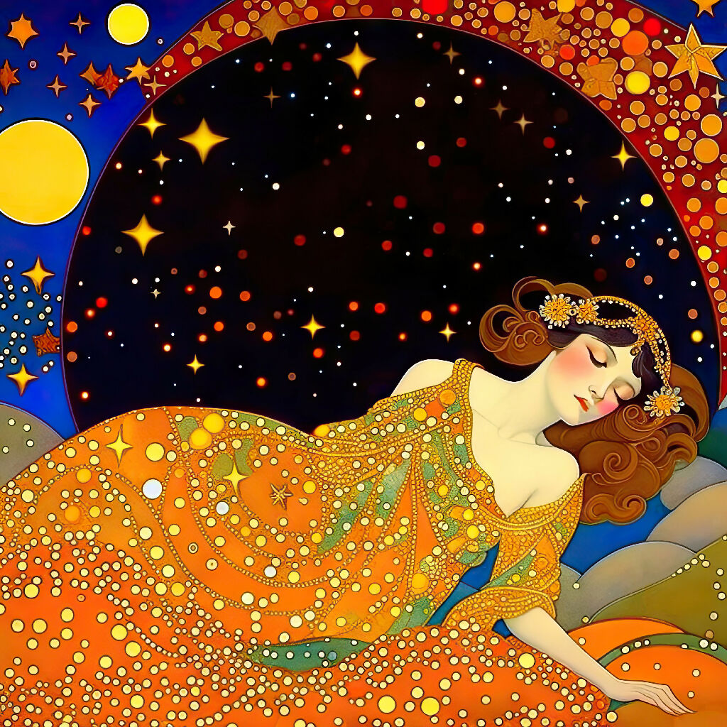 This stunning Art Deco painting, titled "Golden Dreams Under a Starry Sky," captures the essence of luxurious slumber and cosmic harmony. A serene woman, rendered with the sculptural elegance and stylized form characteristic of the era, sleeps peacefully. Her figure is the centerpiece of a grand, geometric composition, surrounded by concentric circles and radiant sunbursts that mimic the structure of a celestial mandala. The night sky above is not a naturalistic portrayal but a masterpiece of Deco design, filled with precise, glittering constellations and sharp, stylized stars. The palette is a sophisticated blend of deep midnight blues, blacks, and shimmering gold leaf, creating a scene that feels both opulent and tranquil. It is a modernist masterpiece, where the geometry of dreams meets the grandeur of the cosmos.