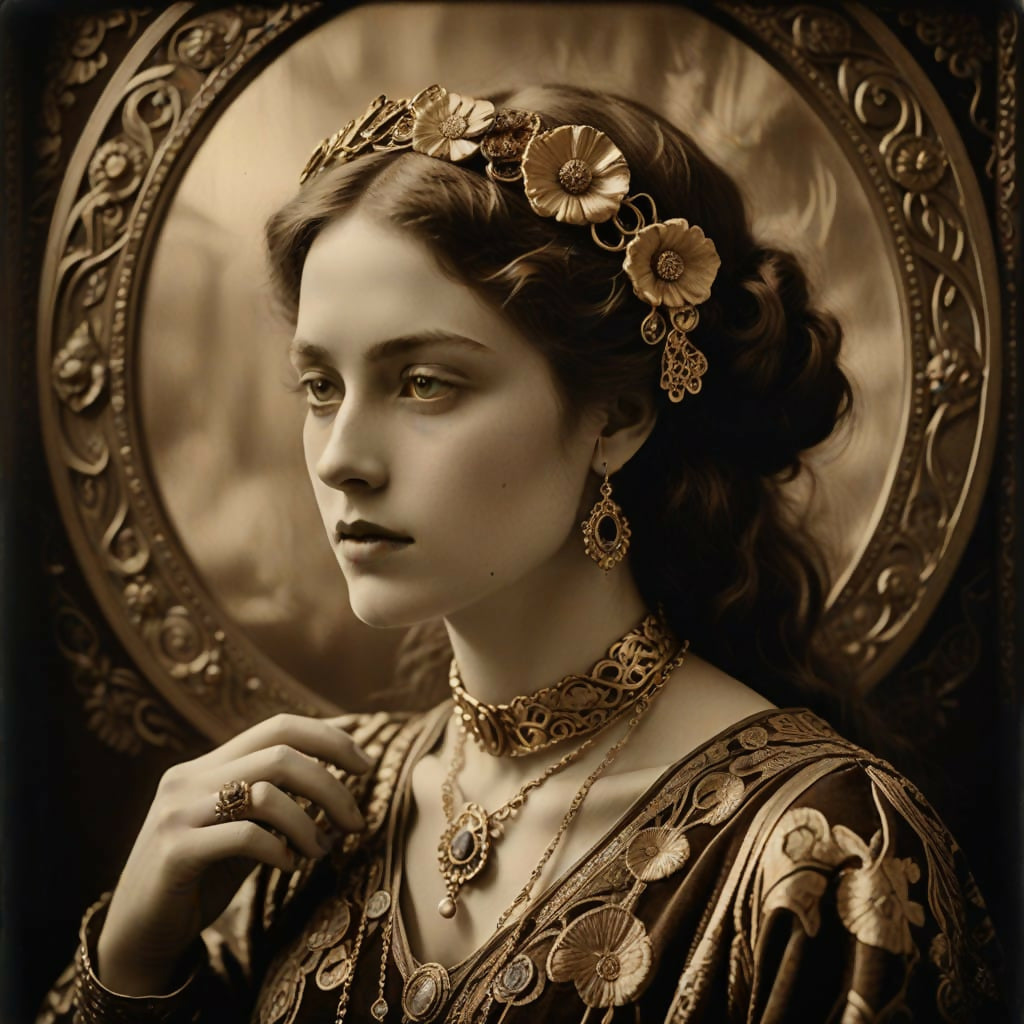 Golden Echoes of Elegance is a timeless AI-generated vintage portrait that captures the grace, sophistication, and quiet strength of classical beauty. Inspired by Renaissance and Victorian-era aesthetics, this artwork features a finely detailed female portrait adorned with ornate floral jewelry, intricate gold embellishments, and a rich sepia-toned palette that evokes history, royalty, and elegance.