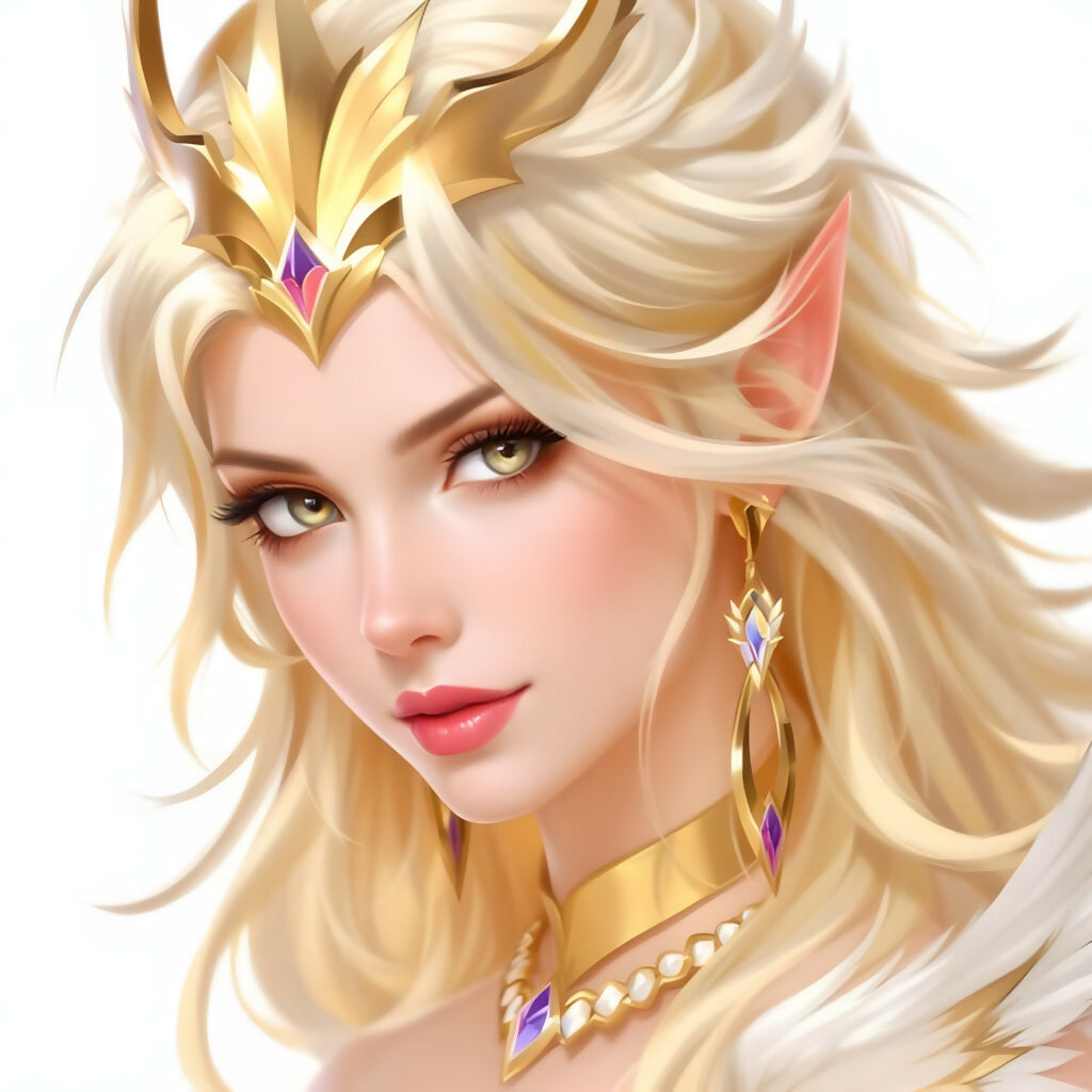 A radiant elven princess graces the frame with elegance and mystery. Her striking golden hair flows like sunlight, and her almond-shaped eyes shimmer with ancient wisdom. Adorned with a regal golden crown and violet crystal jewelry, she exudes nobility, beauty, and enchantment.