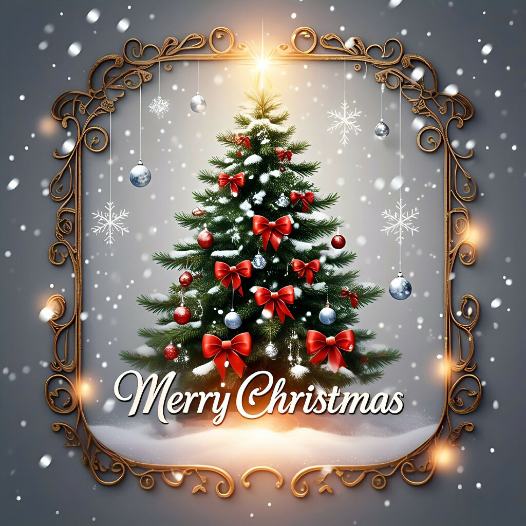 Celebrate the warmth and wonder of the holiday season with Golden Glow Christmas Tree, a richly detailed AI-generated still life artwork. This festive composition features a beautifully adorned Christmas tree wrapped in red bows, shimmering silver and crimson baubles, and surrounded by delicate falling snowflakes. The tree is framed by an ornate golden border with intricate flourishes and hanging snow crystals, adding a regal touch to the serene snowy backdrop.