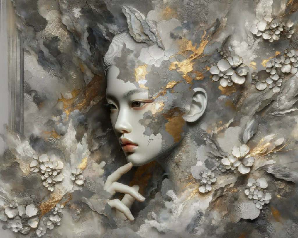 surreal 3D artwork with a female face emerging from swirling metallic and floral patterns with gold accents on a gray background.