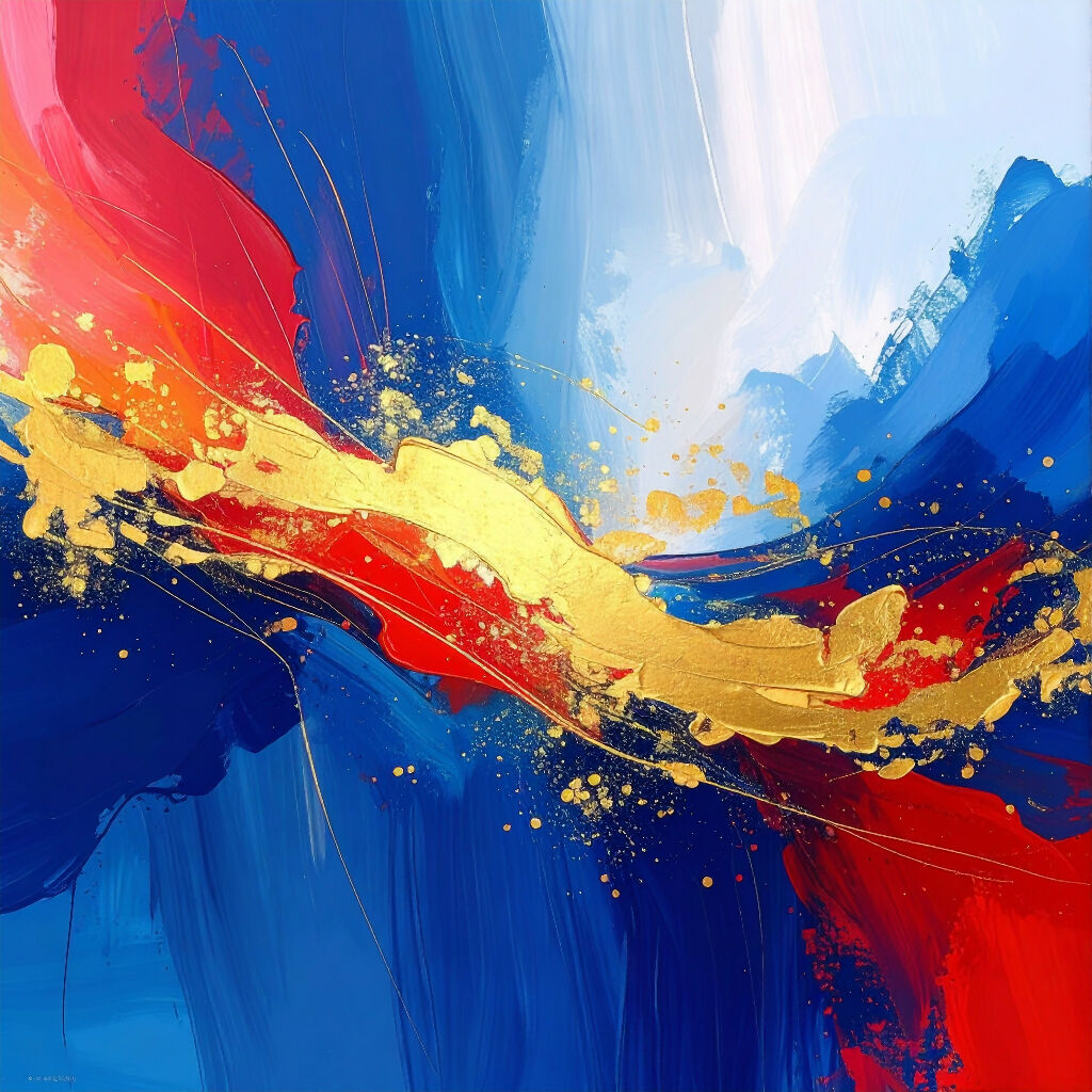 "Golden Horizon" is a luxurious abstract artwork featuring a powerful blend of deep royal blue, vibrant crimson red, and shimmering metallic gold. The dynamic strokes and golden splashes create a sense of movement and energy, making it a perfect centerpiece for modern home or office wall decor. This high-resolution 8K digital artwork radiates elegance, sophistication, and contemporary style.
