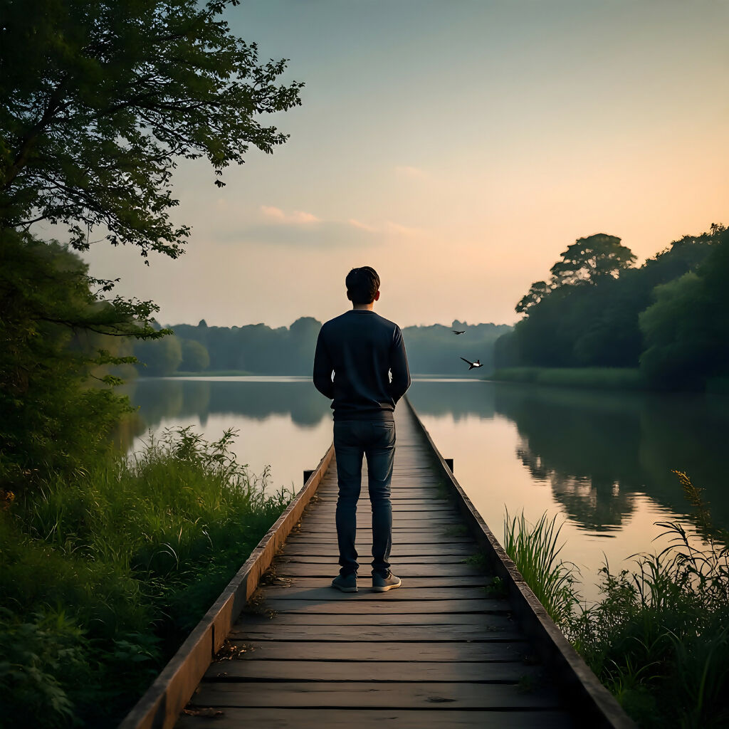 A solitary figure stands on a wooden dock, gazing across a calm lake framed by lush trees and illuminated by the soft glow of sunrise or sunset. Birds soar gently above the water, adding life to the tranquil scene. This artwork tells a story of reflection and connection with nature — the dock symbolizes a pause in life’s journey, while the glowing horizon represents hope and new beginnings. The serene composition invites viewers to embrace stillness, making this piece a perfect blend of emotional depth and natural beauty.