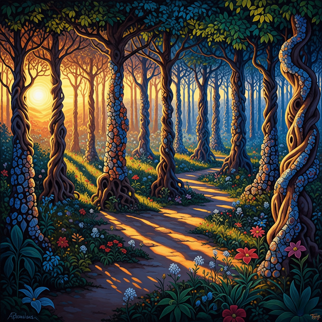 Step into a canvas where the ancient forest meets the fiery hues of a fading day. This piece, "Golden Hour Dreamscape," is a celebration of nature's tranquil beauty.  It captures the fleeting moment when sunlight filters through the dense canopy, painting the woods in a breathtaking palette of amber, gold, and crimson.