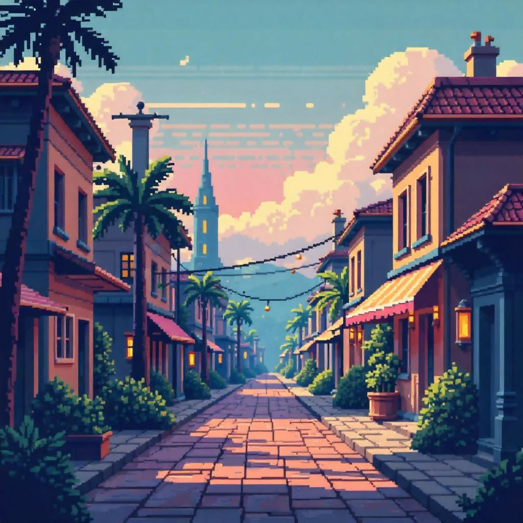 Step into a dreamy Mediterranean street bathed in the warm glow of the setting sun. This AI-generated pixel-art masterpiece captures the charm of old-world architecture, swaying palm trees, and glowing lanterns, creating an inviting and nostalgic atmosphere. The soft pastel sky and distant silhouette of a grand church add depth and wonder to this scenic view.