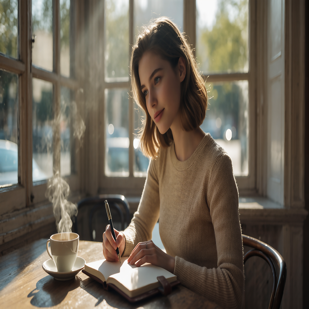 An 8K ultra-realistic cinematic portrait of a young American woman with symmetrical features and radiant skin, writing in a leather-bound journal by a sunlit café window. Captured with Canon EOS R5 in shallow depth-of-field, this image showcases steaming coffee, soft morning shadows, and intimate detail—from textured journal pages to delicate eyelashes.