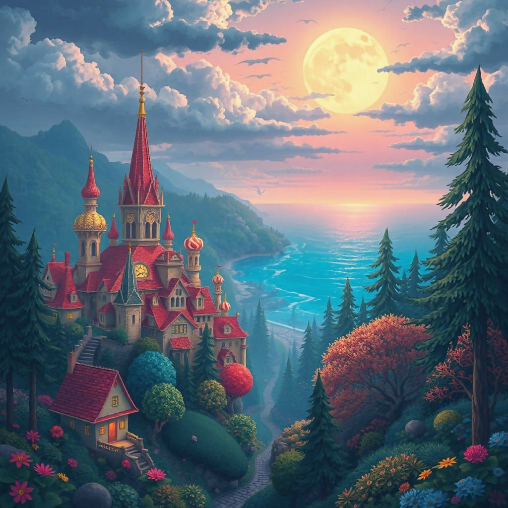 A radiant coastal castle basking in golden twilight, where moonlight dances on waves and turrets rise like dreams from a storybook realm.