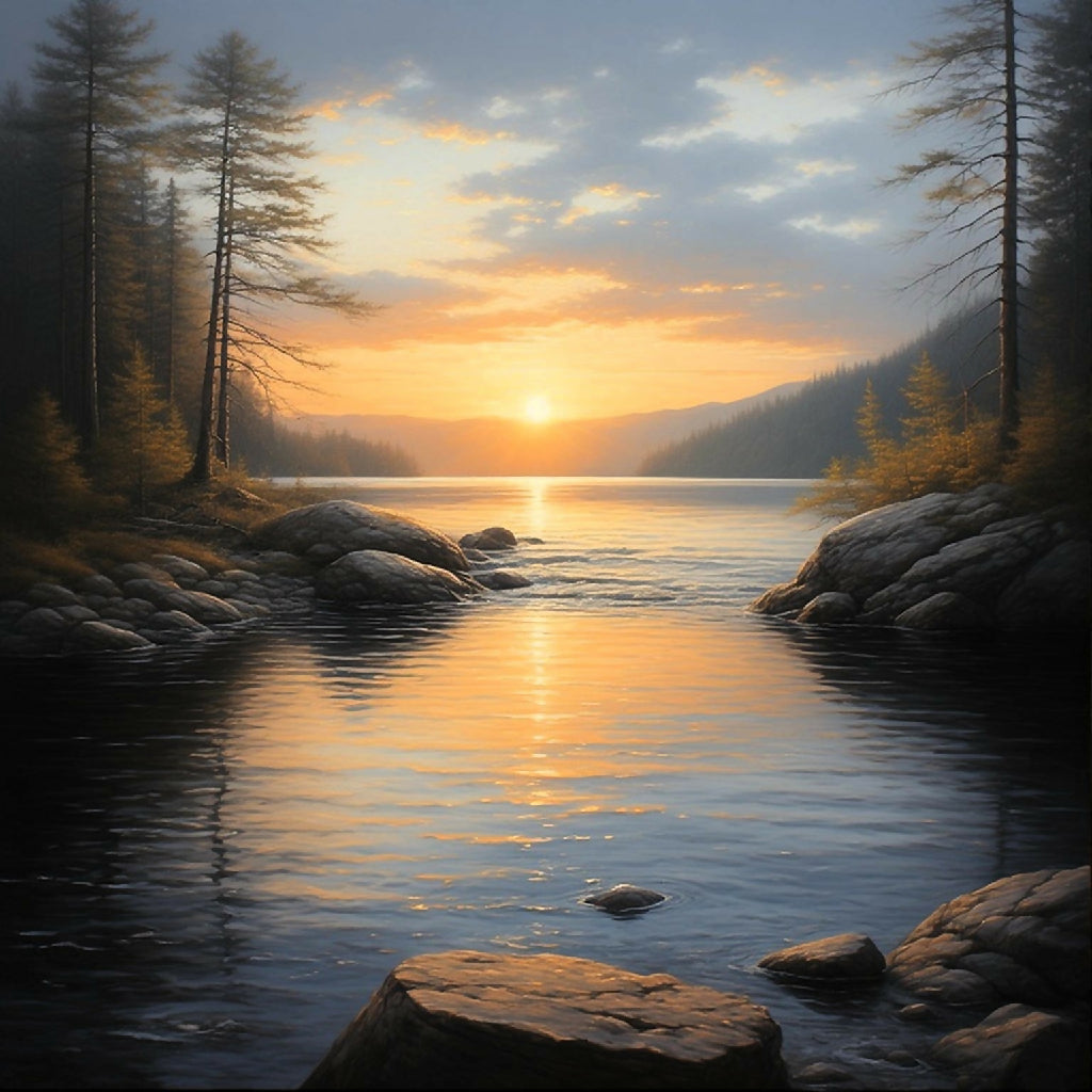 This serene Ai image captures the beauty of a forest lake bathed in the warm, golden light of either sunrise or sunset. Tall evergreen trees line the rugged shores, their dark silhouettes contrasting with the vibrant sky. The sun, a brilliant orb on the horizon, casts a shimmering path of light across the calm waters, creating reflections of the sky's soft blues, oranges, and yellows.