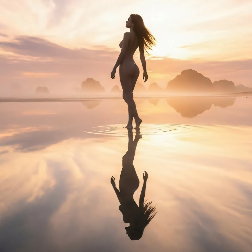Ethereal color portrait of a woman standing in water, perfectly reflected against a soft, misty golden sunset.