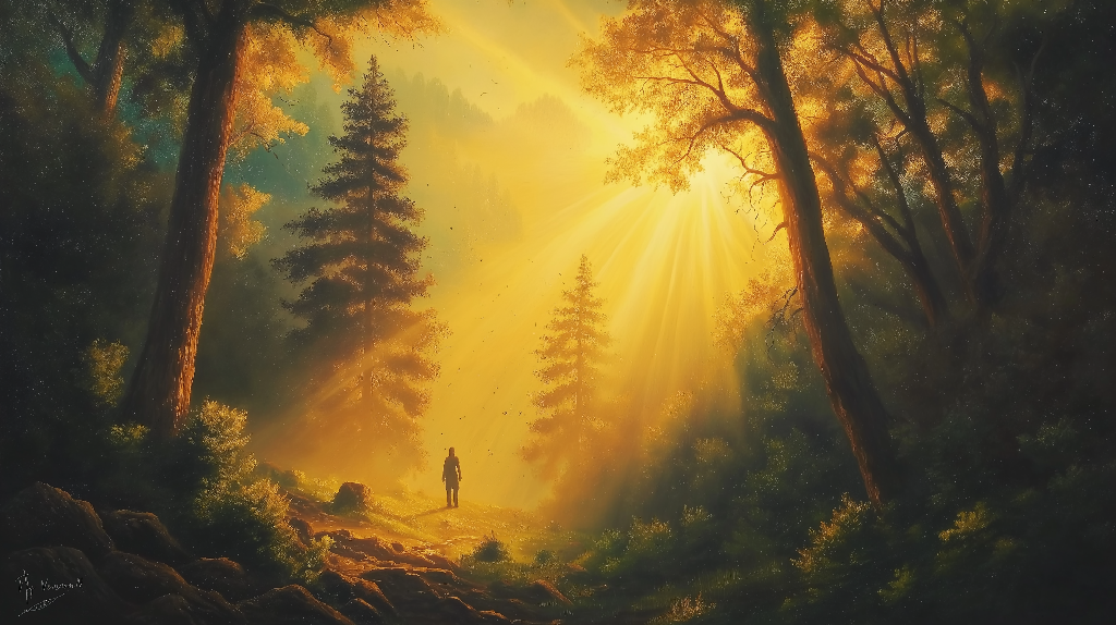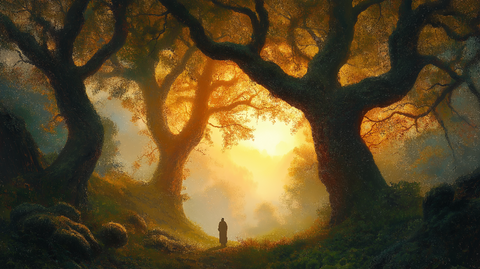 This breathtaking collection features hyper-realistic digital oil paintings of a lone figure standing at the edge of a vast, misty forest during the golden hour. Rays of sunlight pierce through ancient, twisted trees, enveloping the scene in rich hues of vibrant orange, deep emerald green, and muted sapphire blue.
