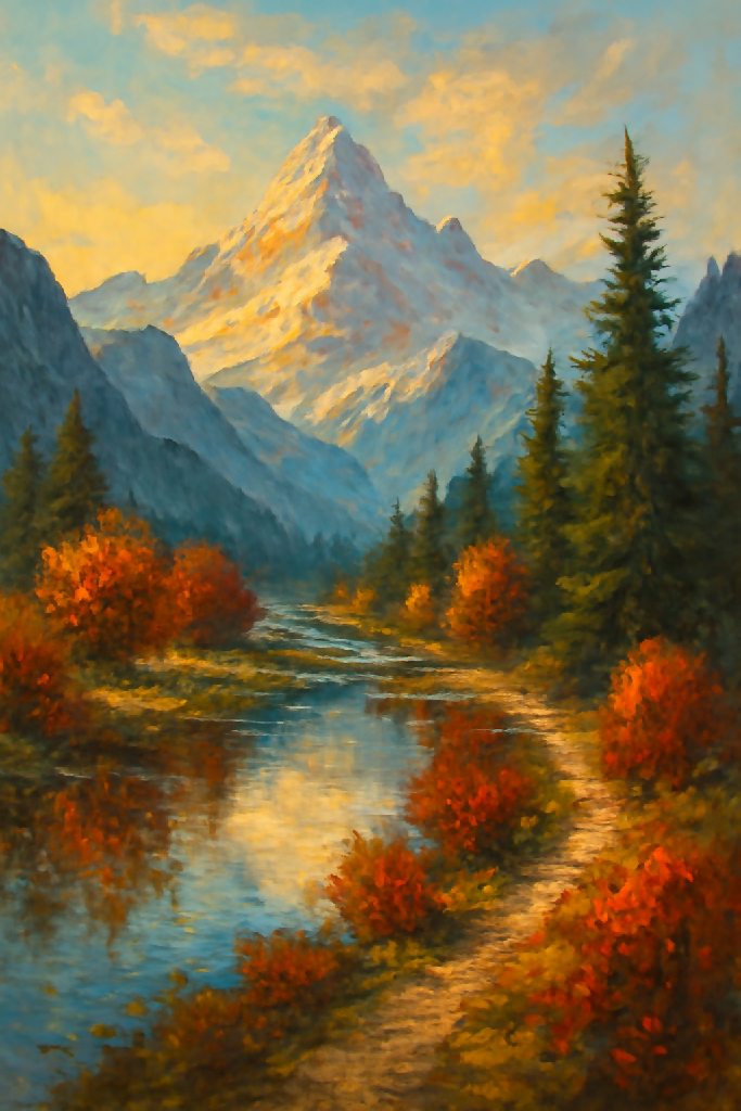 Golden Mountain Serenity" captures the tranquil beauty of a snow-covered mountain range, bathed in the warm golden light of late afternoon. The scene features rugged peaks reflecting dramatic light and shadow, surrounded by vibrant autumn foliage and a serene waterway. The winding dirt path invites the viewer to take in the peaceful beauty of nature, blending cool and warm tones for a captivating effect. This digital painting in an impressionist style brings the timeless beauty of nature to life.