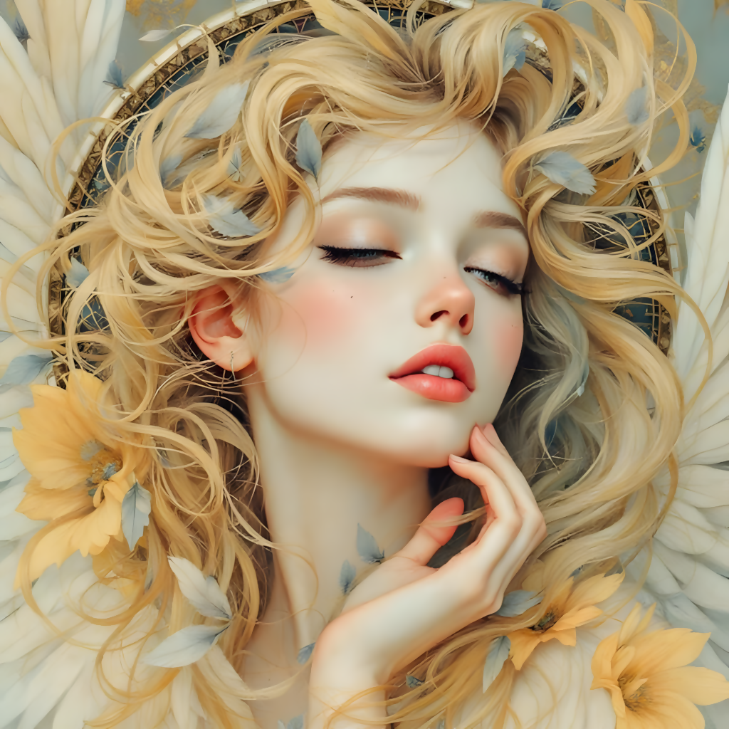 Radiating serenity and warmth, Golden Seraph – Angel of Light and Grace captures the ethereal beauty of a celestial being bathed in soft golden light. Surrounded by delicate feathers and golden blooms, her peaceful expression invites calm and reflection—perfect for elevating any space with divine elegance.