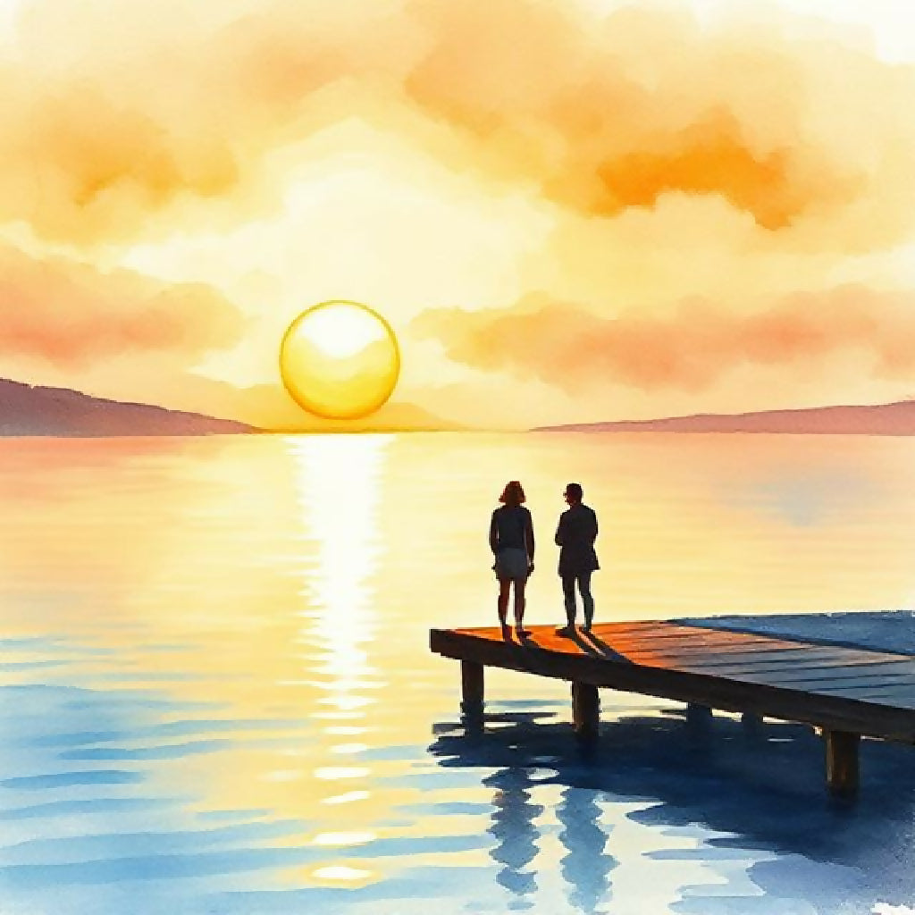 A watercolor-inspired scene of two figures standing on a wooden pier, quietly watching the sun dip into the horizon. The golden light spills across the calm water, blending with soft shades of orange and blue. This artwork evokes the peaceful beauty of unspoken moments, where silence itself becomes a language of connection.