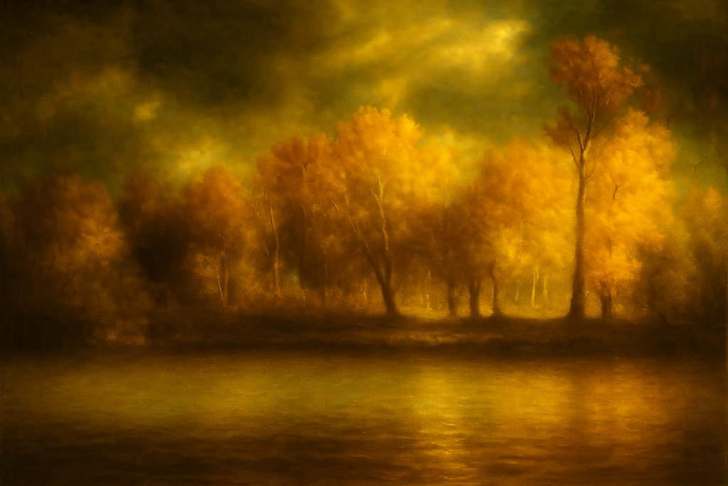 Step into the stillness of a golden autumn afternoon, where the forest glows under an enchanted sunlight and the river drifts in peaceful silence. Inspired by the delicate chiaroscuro of Dutch master Vermeer, this artwork captures the timeless play of light and shadow. A luminous tribute to nature’s quiet majesty, perfect for interiors that seek both warmth and wonder.