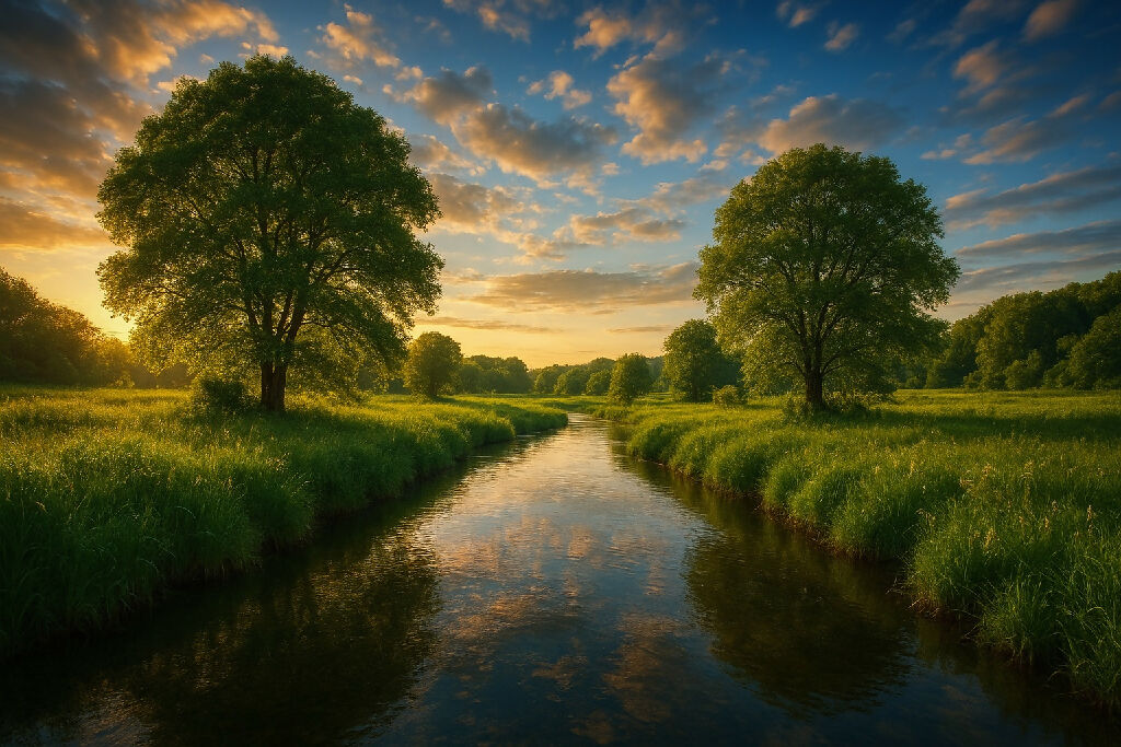 A stunning sunset view with golden light reflecting on a calm river surrounded by vibrant meadows and tall trees, creating a warm and captivating atmosphere.