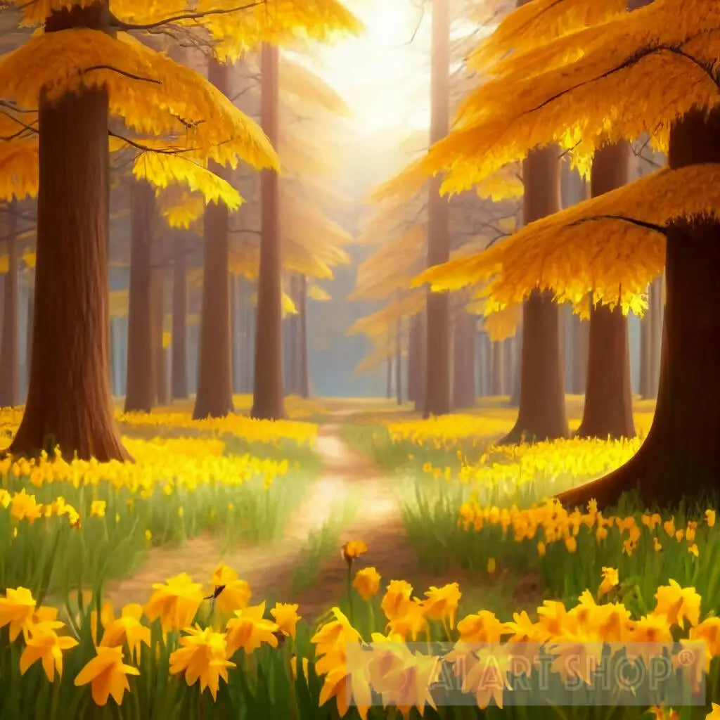 Amidst this natural cathedral, a carpet of golden daffodils stretches as far as the eye can see, their delicate petals swaying gently in the whispering breeze. Each flower seems to hold a tiny sun within its center, radiating warmth and vitality amidst the cool embrace of the forest.