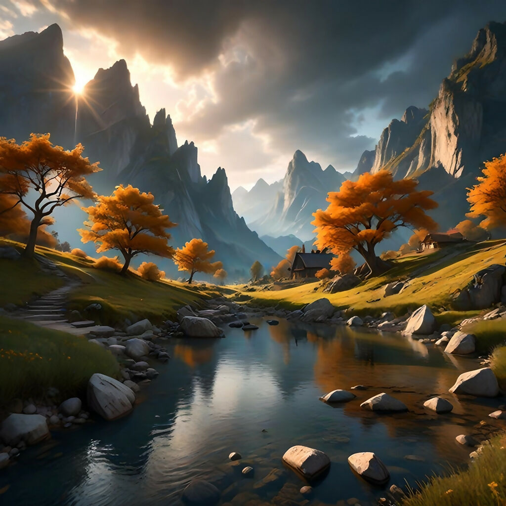 This AI-generated illustration captures the serene beauty of an autumn valley at sunrise or sunset. Jagged mountain peaks rise dramatically in the background, bathed in warm light and framed by dramatic clouds. A calm stream flows through the foreground, reflecting vibrant orange-leaved trees and rustic wooden houses nestled among the rocks. The interplay of light, shadow, and seasonal color creates a tranquil and immersive scene that celebrates nature’s quiet majesty.