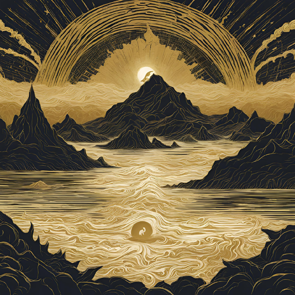 Engraving or Etching Aesthetic: The fine gold lines on a dark background mimic the look of an old-world engraving or relief print, giving it a vintage, mystical quality.