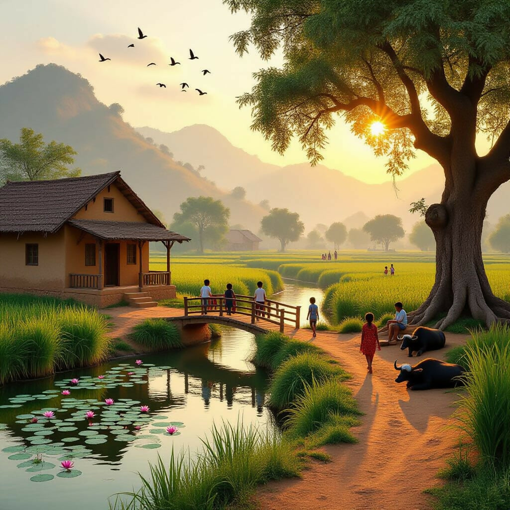 This artwork captures the heart-touching beauty of an Indian village glowing in warm golden-hour light. A cozy mud house sits beside a calm emerald river, surrounded by wheat fields, lotus-filled water, and a curved mud pathway leading toward sunset-lit hills. A banyan tree filters soft sunlight as villagers cross a wooden bridge and buffalo rest near the river. Painted in a watercolor + oil mural blend with cinematic tones, this wallpaper delivers a deeply emotional, soothing, and premium rural landscape that instantly elevates any