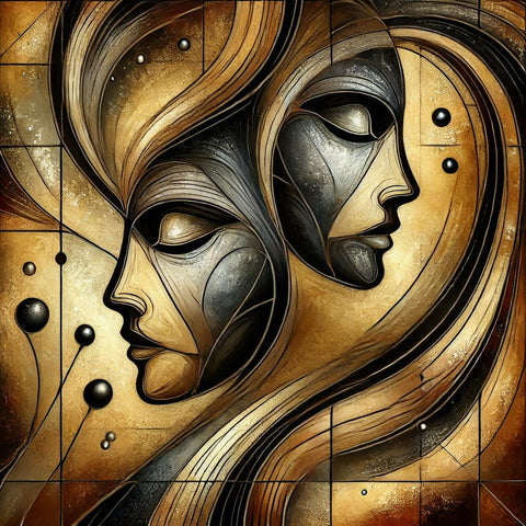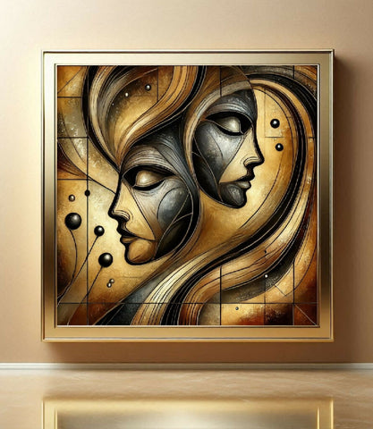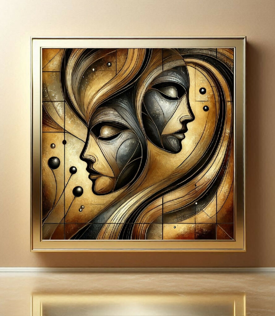 Ein abstraktes Kunstwerk, das zwei stilisierte Gesichter zeigt, die ineinander verschlungen sind und von geschwungenen, goldenen und dunkelgrauen Linien umgeben sind. Die Gesichter sind im Art-Deco-Stil gehalten und haben ein metallisches Aussehen.